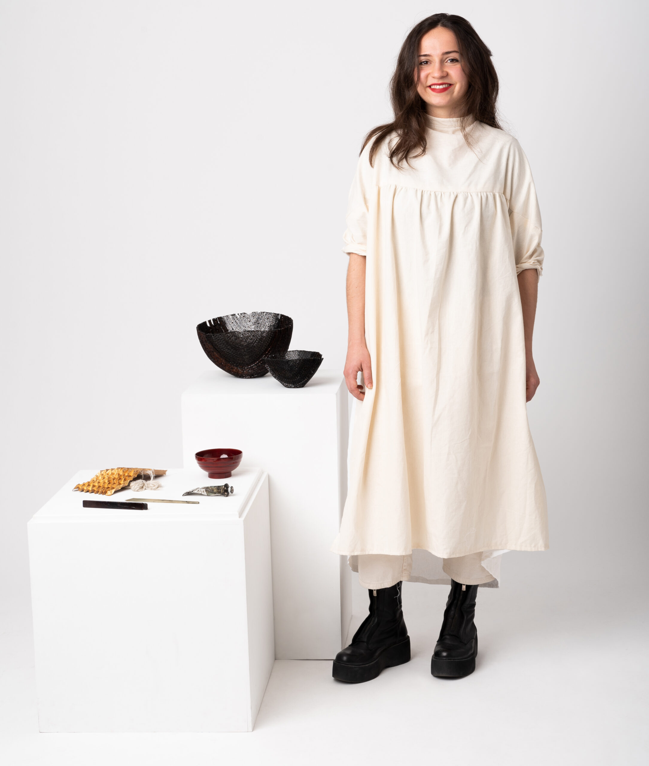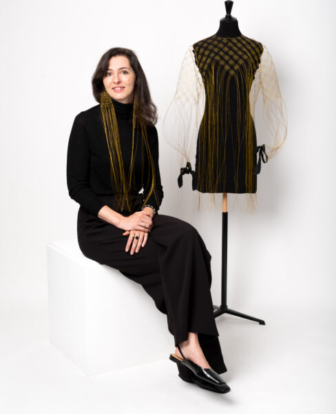 Après 7 ans dans l’architecture, Cécile Gayraud, alias GRAY, devient designer textile, mode et accessoire. Elle se forme à l’Atelier Chardon Savard au stylisme, puis développe son propre savoir-faire de maillage métallique. Des centaines de câbles dorés sont sertis à la main et mis en volume pour donner corps à des vêtements-bijoux. À la fois technique et sensible, la créatrice trouve sa créativité dans le croisement des disciplines et des échelles. En 2018, elle remporte le prix du public lors du 33ème Festival de mode de Hyères (catégorie accessoire) et collabore aujourd’hui avec des maisons de luxe comme Hermès ou encore Lemarié (métiers d’art Chanel), en parallèle de ses propres collections.