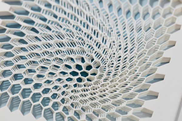 Marie Gobert, a paper expert, explores the infinite possibilities of this material with remarkable finesse. Fascinated by fractals, she meticulously handcrafts bas-reliefs and abstract architectures with precision. She creates dreamlike universes using lacework and accumulations of fragments cut with a scalpel.