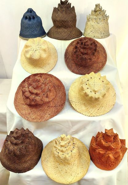 Senia Jugi is a native Iban master of traditional and contemporary basketry and hats, designated as Living Legend by Sarawak Malaysia in 2018. She works with the longhouse women of Rumah Ensong, Kapit to produce Topi Tunjang rattan hats.