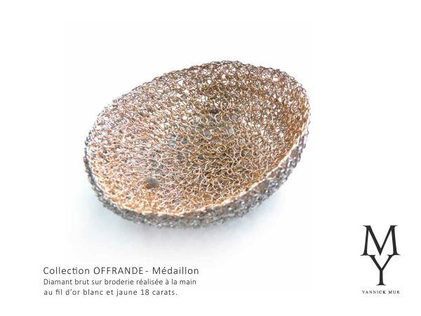 Yannick Mur’s creations are a fruitful encounter between her quest for innovation and the poetry of the materials she uses. Instinctively, she designs an embroidery technique compressed wire gold or silver weaving volumes letting in light. YM, creations that play delicately with the codes of contemporary jewellery design.