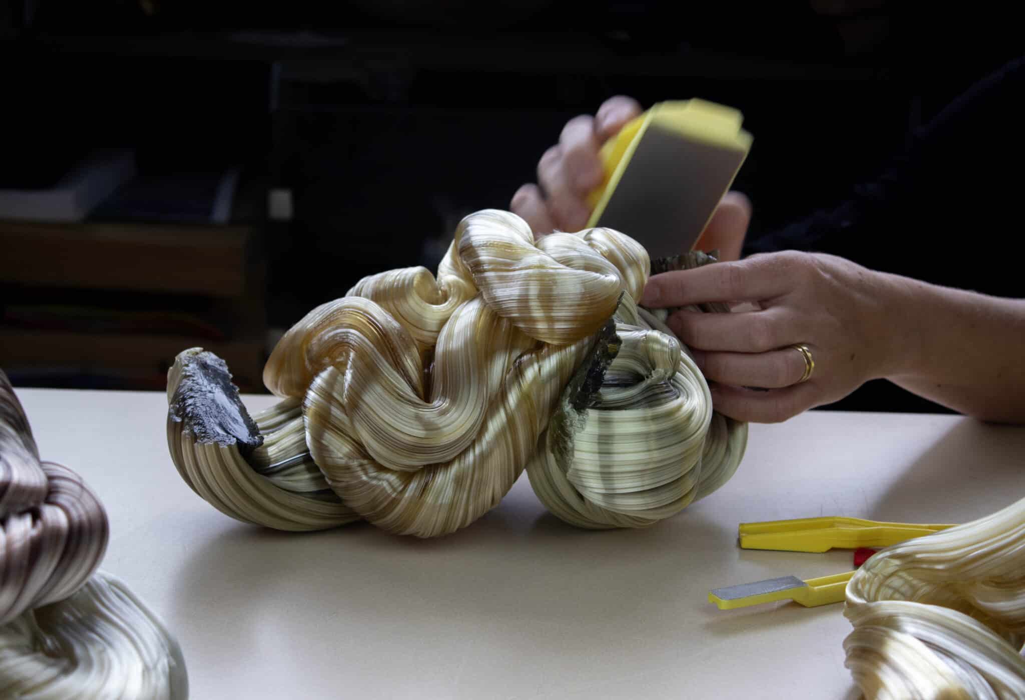 In addition, by stretching and folding hot glass, the strings on the outside cools down much faster than the warm core, offering a unique opportunity for me to work with the illusion of softness and create moments frozen in time. In the last seconds of malleability, I shape the glass by hand wearing heat resistant Kevlar gloves.