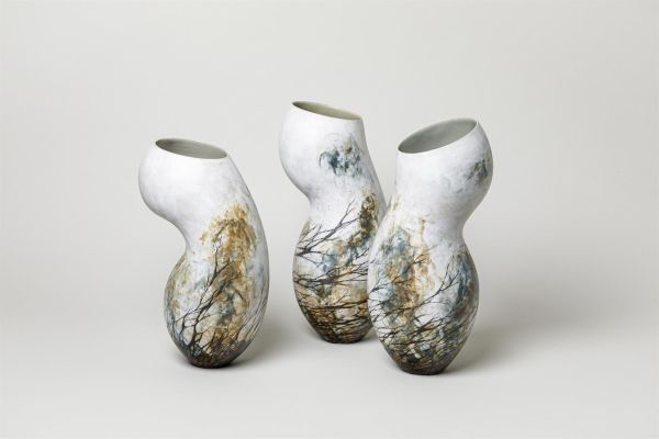 Pièces uniques en grès décorées à main levée. Construction des pièces au tour et/ou au colombin. Décors abstraits aux engobes et oxydes.