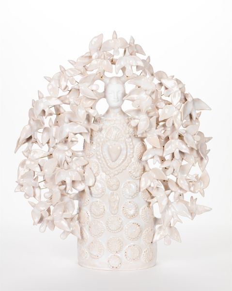 Je travaille la céramique et je suis spécialisée en faïence émaillée. J'y allie mon goût pour le votif, le rite et l’étrange dans deux matières de prédilection : la céramique et le tissu dans des sculptures et installations.