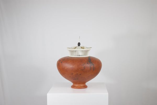 Je suis céramiste, je travaille essentiellement avec la porcelaine que j'ajoure. D'autres matériaux s'ajoutent également à mes pièces tels que le laiton, le bois, le cuir, la faïence et le grès.