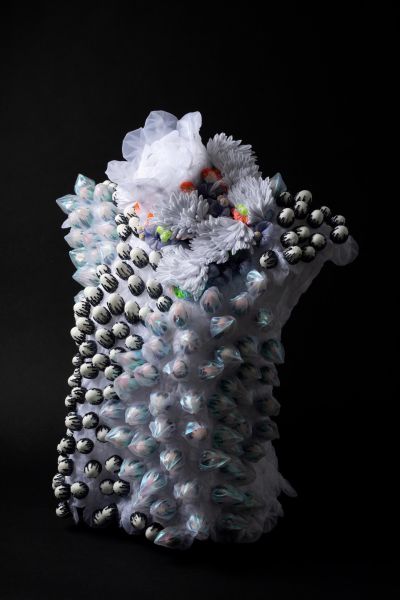Je combine mes bijoux avec des sculptures imposantes utilisant de très grandes quantités de cocons. Mon savoir- faire est la broderie à aiguille, la technique de bijouterie et j'intègre la technique traditionnelle (le kumihimo passementerie ancestrale japonais) dans mes créations.