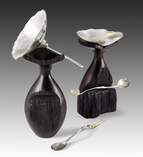 Joaillière et orfèvre, je forge exclusivement à la main les métaux précieux, utilisant des techniques de réticulation et de fusion des ors entre eux et de l’or fin sur argent pour obtenir des effets de matières. Mes pièces d’art de la table et mes bijoux, tous uniques, évoquent tantôt la nature, la puissance des volcans ou l’univers cosmique.