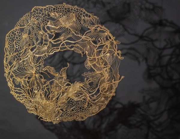 Marie De Decker habille et habite l’espace d’or, réinventant la dorure traditionnelle selon sa vision contemporaine. Son motif organique, tel un filigrane d’or pur, déploie plumes et écailles à l’infini dans un mouvement poétique léger et gracieux. Poussant les limites entre matières naturelles, lumière et espace. Un dialogue entre terre et ciel.