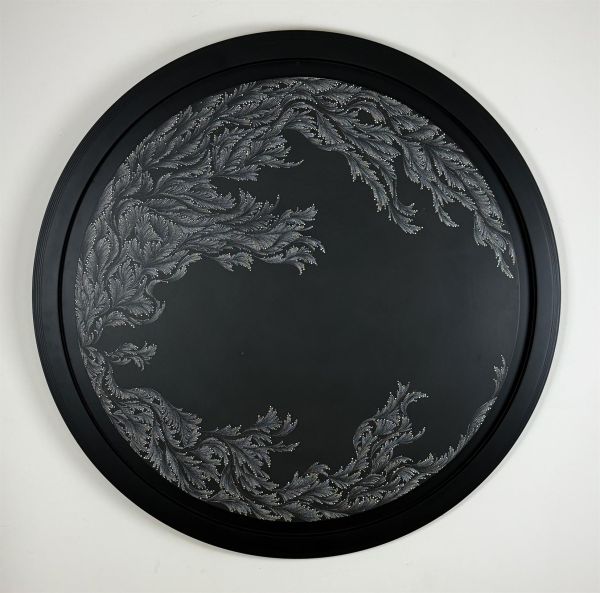 De mon métier de doreur sur bois, j’ai souhaité en réinterpréter et modifier ses techniques, et ainsi modeler une symbiose entre la matière et le savoir-faire. A travers ces quelques points, dénués de trame narrative, le rythme introduit la durée, la permanence et l’infini. J’essaie de rendre ce mouvement hybride, brisant les cadres.