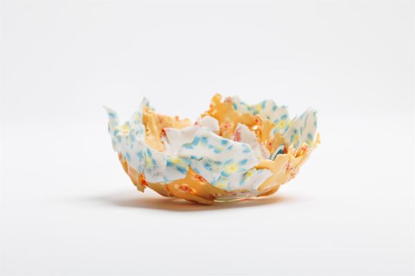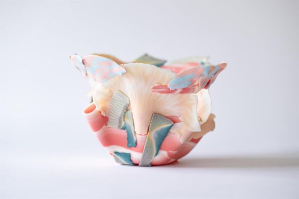 Ni peint ni imprimé : motifs teintés dans la masse de la porcelaine. Je colore ma porcelaine avec du pigment de couleurs, puis modèle des motifs, morceau par morceau, ligne par ligne. J’assemble ces motifs, tranche et assemble de nouveau… pour parfaire un motif final. Puis, je lui donne une forme avec un moule en plâtre. Cuisson au four électrique.