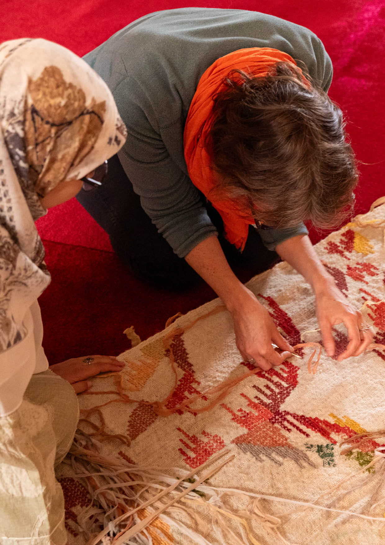 Quand Camille Bertrand crée Brodeuse Voyageuse en 2020, elle souhaite développer une proposition textile plus vertueuse pour l'artisanat et son environnement. Derrière chaque tissage et broderie se cachent, entre autres, Kaoutar, Fatima, Roukia et Souad. Elles sont les artisanes qui, par leur savoir-faire, jouent un rôle essentiel et sont actrices de leur émancipation.