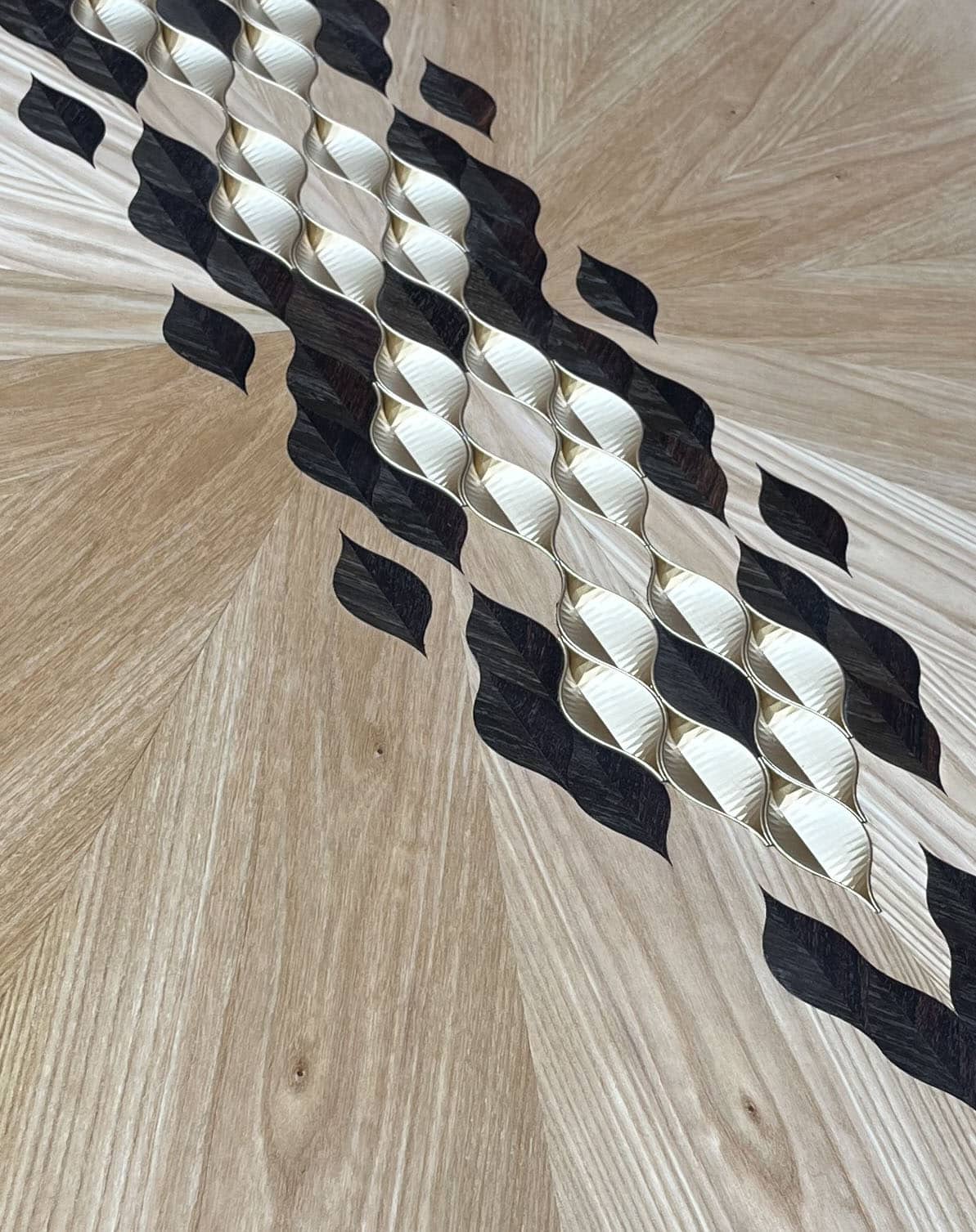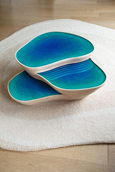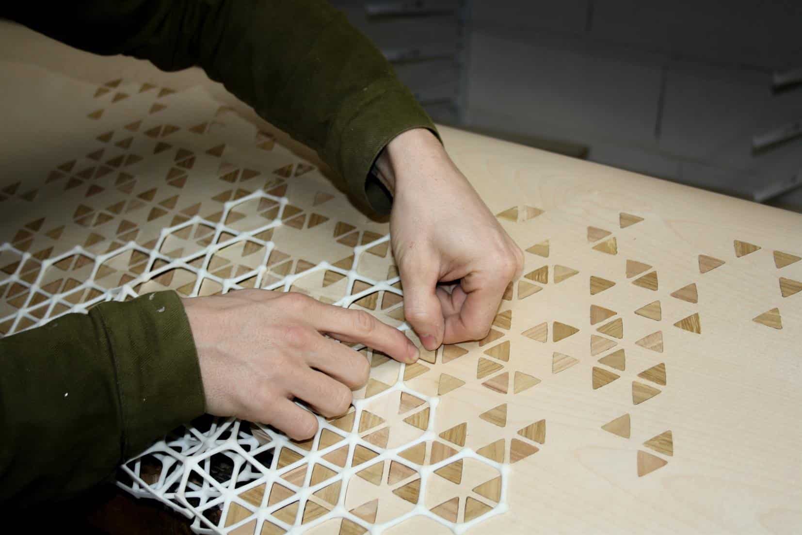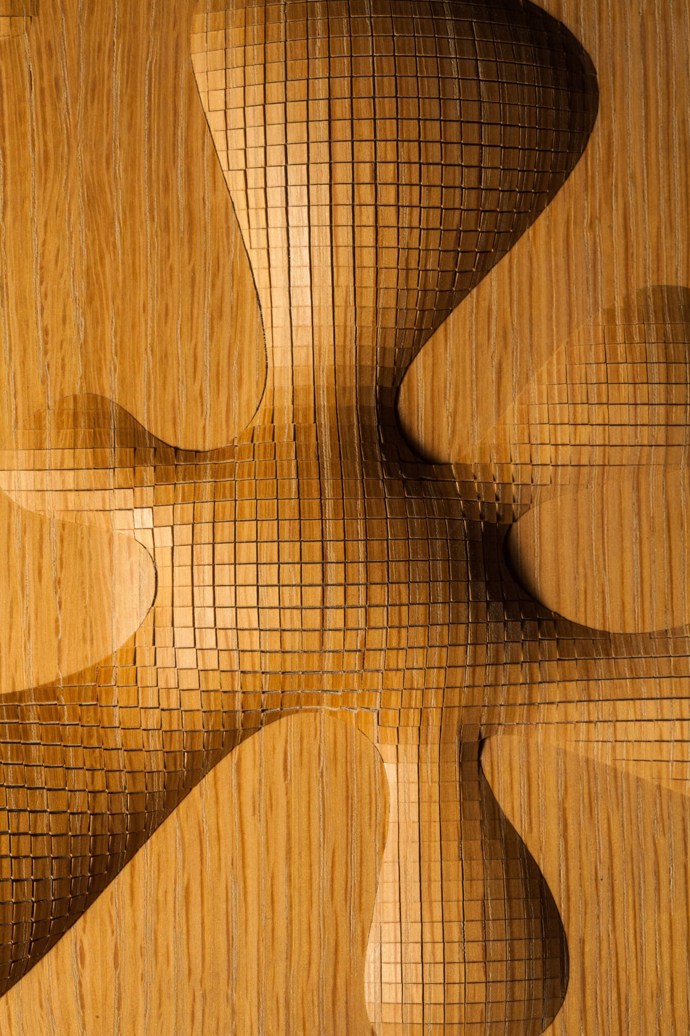 Artisan diplômé en menuiserie et ébénisterie, Raphaël Cuevas débute par la création d’aménagements sur mesure et de pièces de mobilier uniques ou en petites séries. La rencontre avec Line Pierron, designer diplômée de l’École Supérieure d’Art et de Design de Reims, donne naissance au Studio Line et Raphaël. Passionnée par l’impression 3D, Line avait déjà fondé sa propre marque d’objets décoratifs, Imprime-moi un mouton – un clin d’œil à Saint-Exupéry qui souligne son goût pour les formes inédites, impossibles à réaliser autrement qu’en impression 3D. En associant design, savoir-faire artisanal et technologies de pointe, Line et Raphaël conçoivent et fabriquent à la main un mobilier futuriste, orné de marqueteries 3D en relief. « La marqueterie est une technique très ancienne, mais notre démarche est résolument contemporaine, explique Raphaël. Nous l’avons faite passer de la 2D à la 3D, en volume, avec des motifs complexes et organiques. Nos meubles deviennent des tableaux en relief. ». Toutes leurs créations sont fabriquées à la main dans leur atelier, en pièces uniques ou petites séries, pour des clients particuliers ou des professionnels. Une fois le motif dessiné, Line en code la version numérique afin d’en automatiser la découpe – un gain de temps et la possibilité de reproduire les modèles avec précision. « La 3D libère le dessin, dit Line. C’est un champ infini, nous avons encore tant à explorer. ».