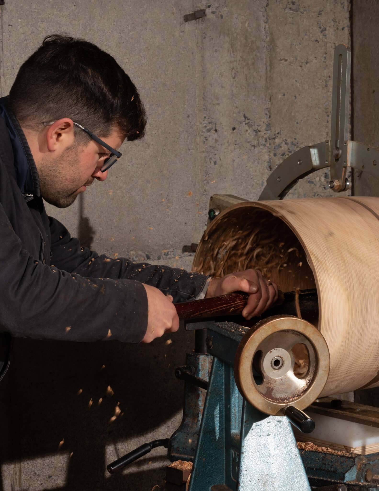 Parmi ses réalisations : du mobilier singulier, des aménagements d’espaces publics, et une collection de récipients sculpturaux tournés en bois. Ses recherches récentes portent avant tout sur la quête de la forme juste pour chaque objet, tout en révélant les qualités intrinsèques du bois.