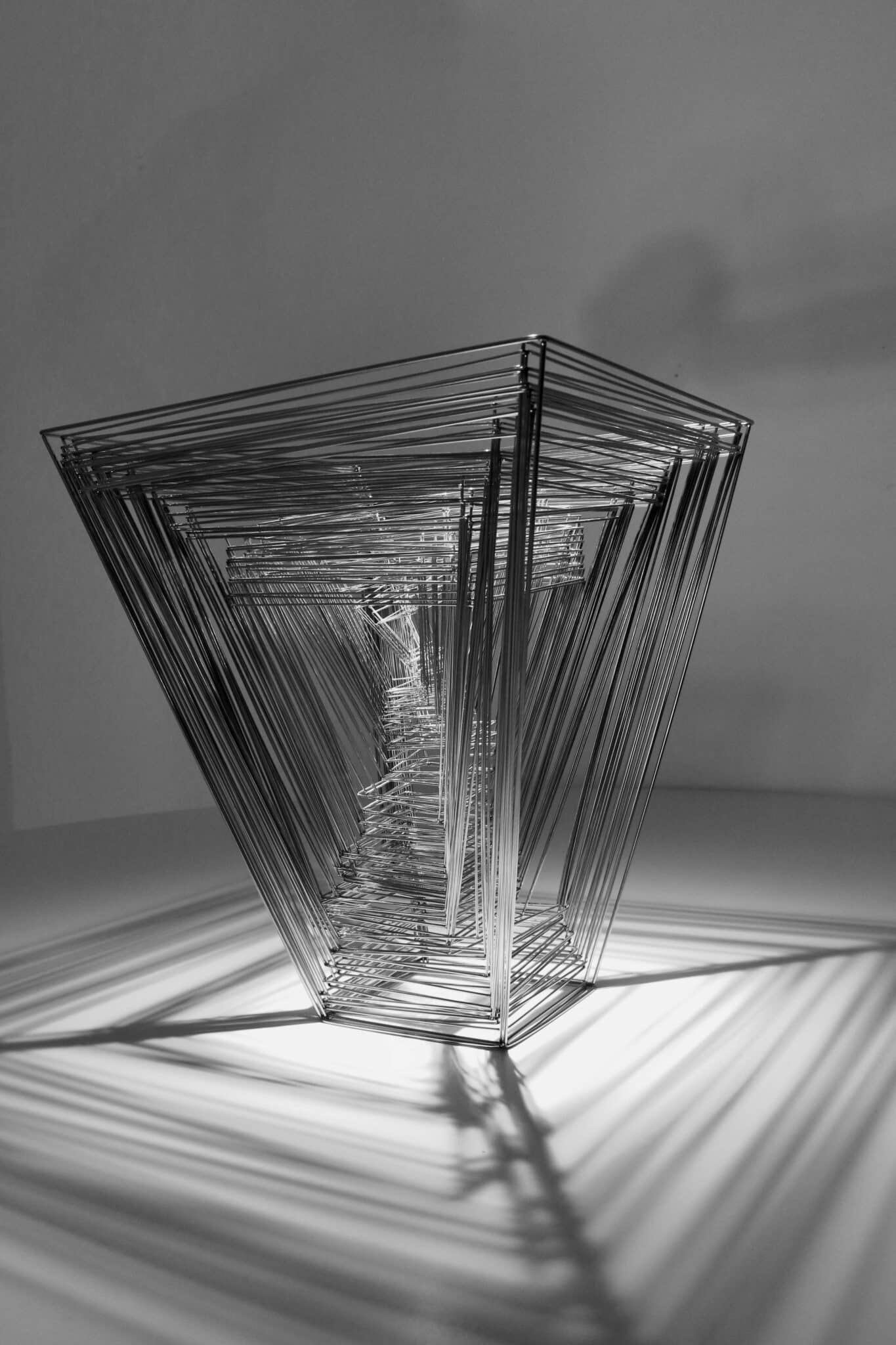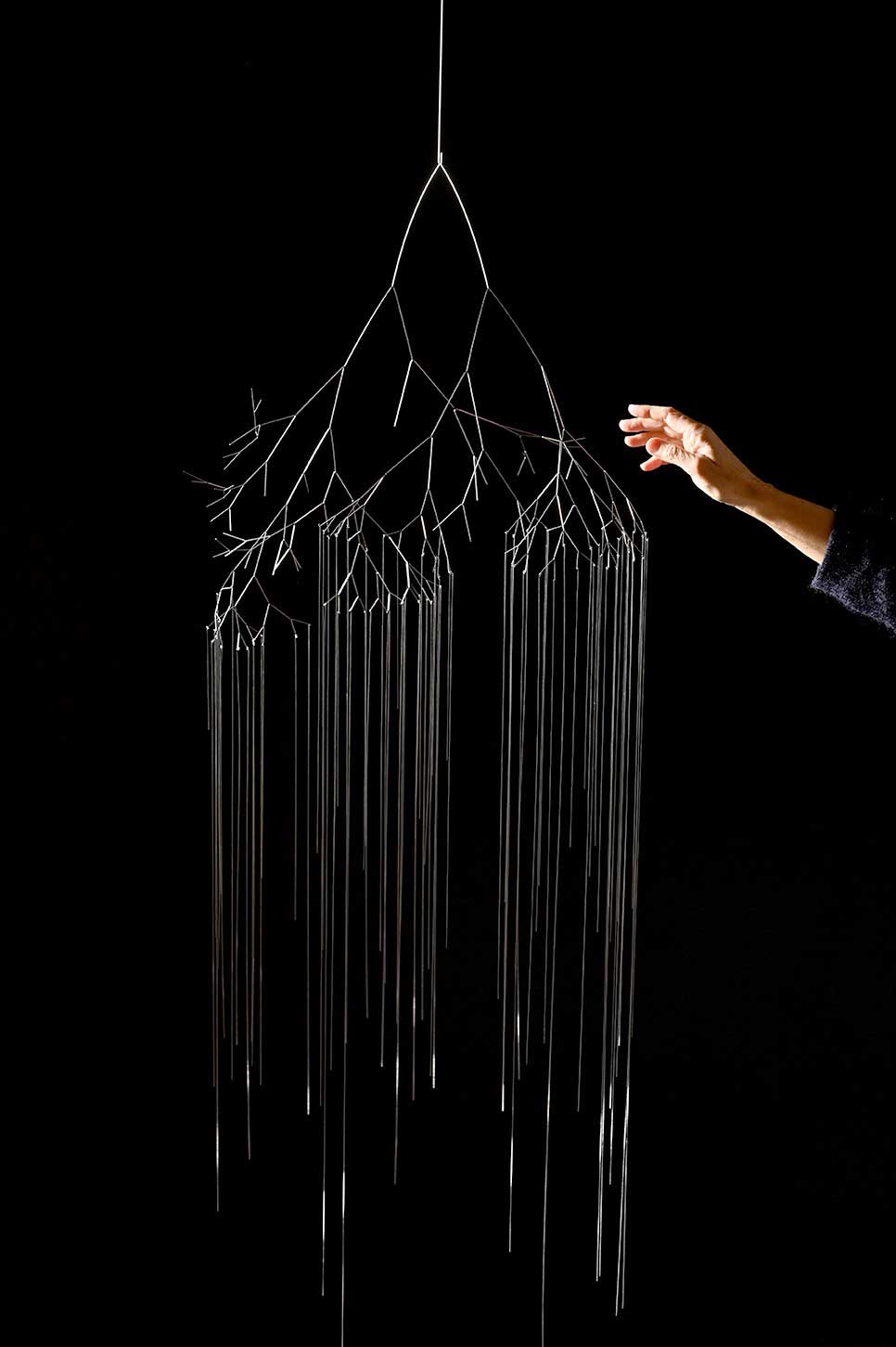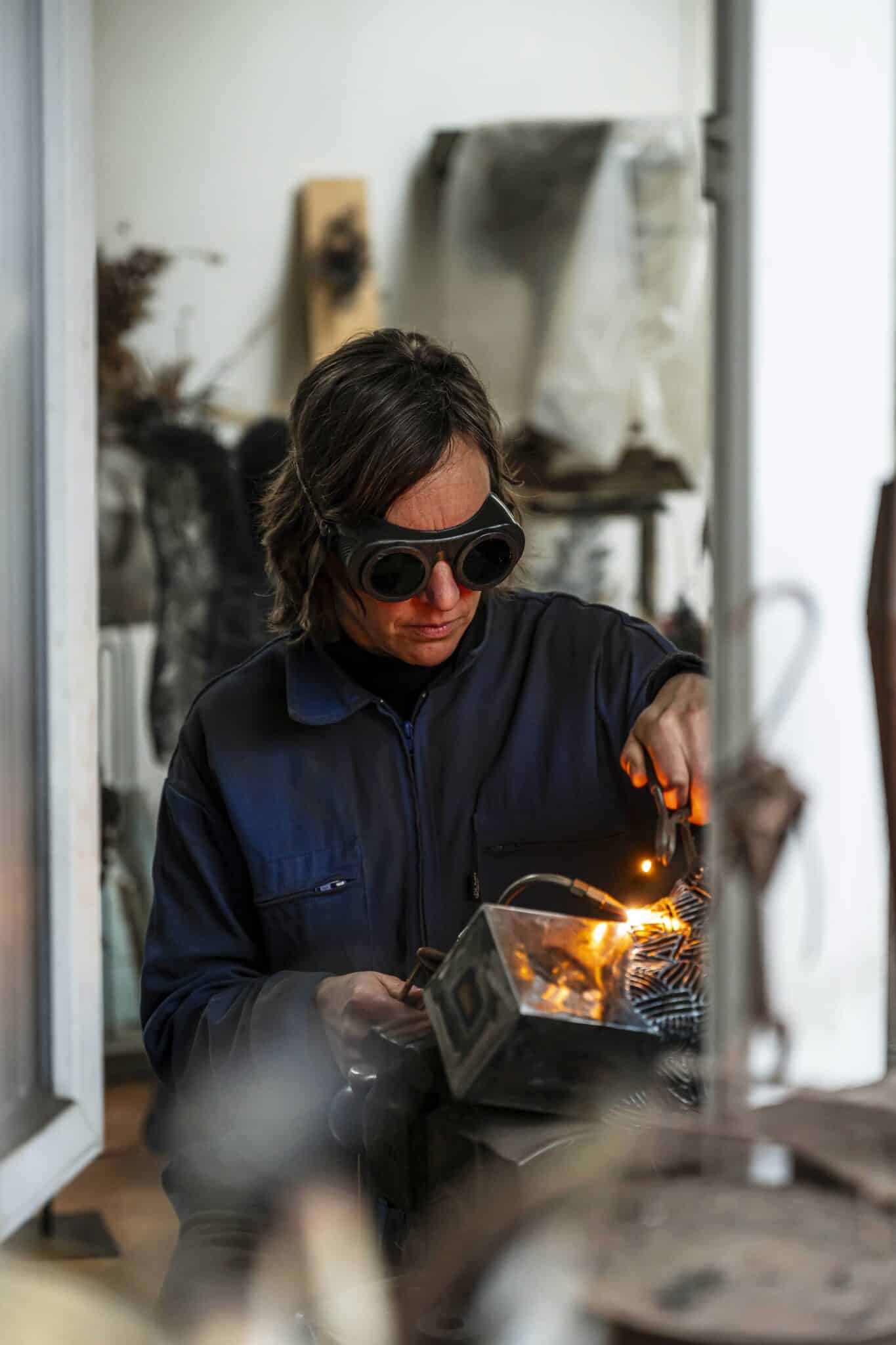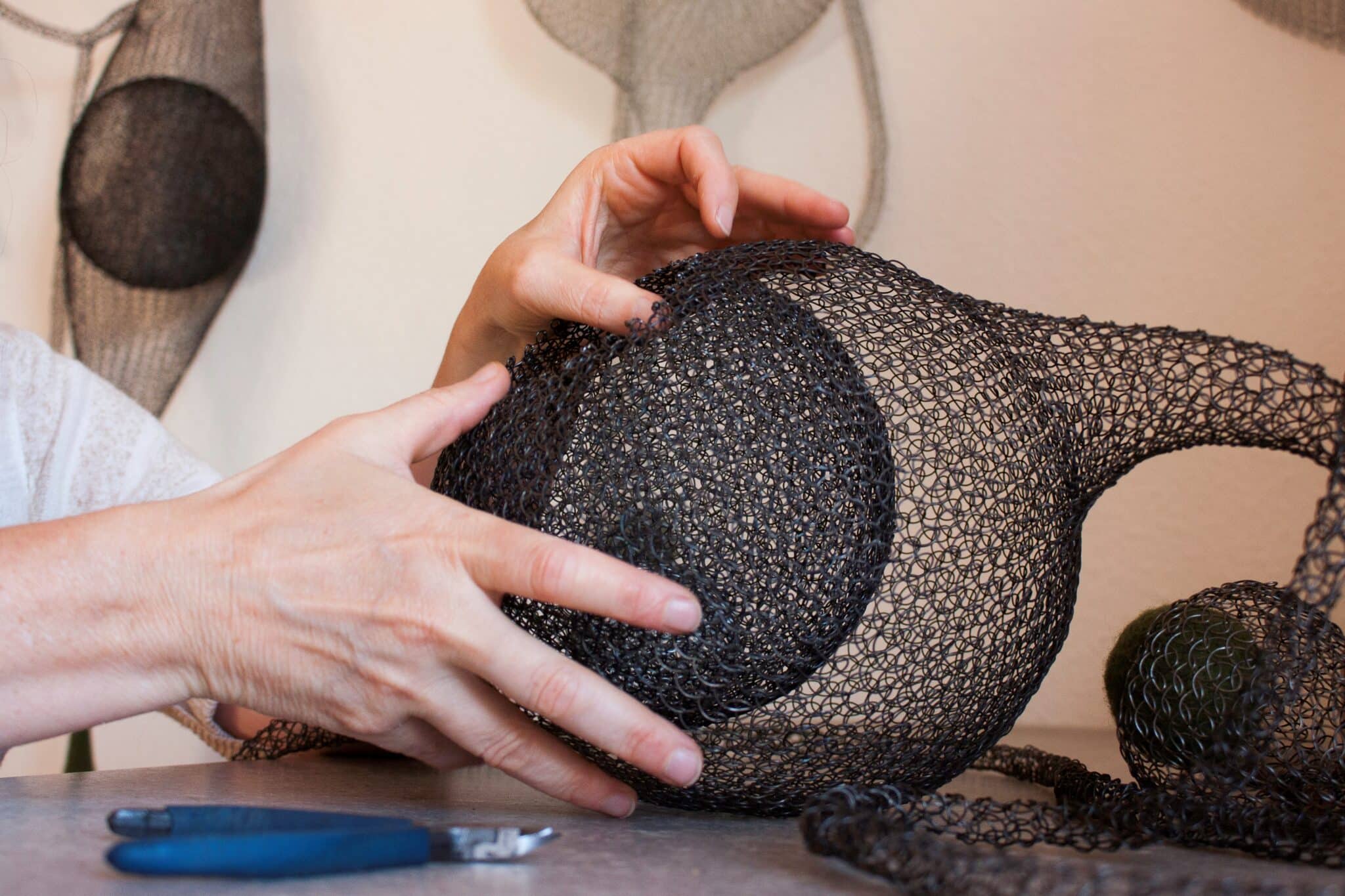 Les sculptures en fil métallique de l’artiste se déploient dans l’espace avec liberté, suspendues, posées ou accrochées au mur. Entre équilibre et mouvement, elles explorent les contrastes — souplesse et rigidité, transparence et opacité, plein et vide — pour révéler un espace intérieur comme lieu de respiration. Son geste artistique s’allège au fil du temps : les formes deviennent plus aériennes, les volumes plus épurés. Chaque création est issue d’une recherche intuitive, dans un atelier pensé comme un laboratoire vivant, où la curiosité guide l’évolution des pièces. Sa technique de prédilection est un maillage artisanal hérité d’anciens savoir-faire, autrefois utilisés pour la fabrication de bijoux et de contenants. À partir de bobines de fil métallique, elle construit patiemment les volumes, ajustant chaque maille à la pince. Ce travail minutieux valorise la richesse expressive du fil : à la fois brut et raffiné, rigide et souple, il devient un matériau sculptural unique.