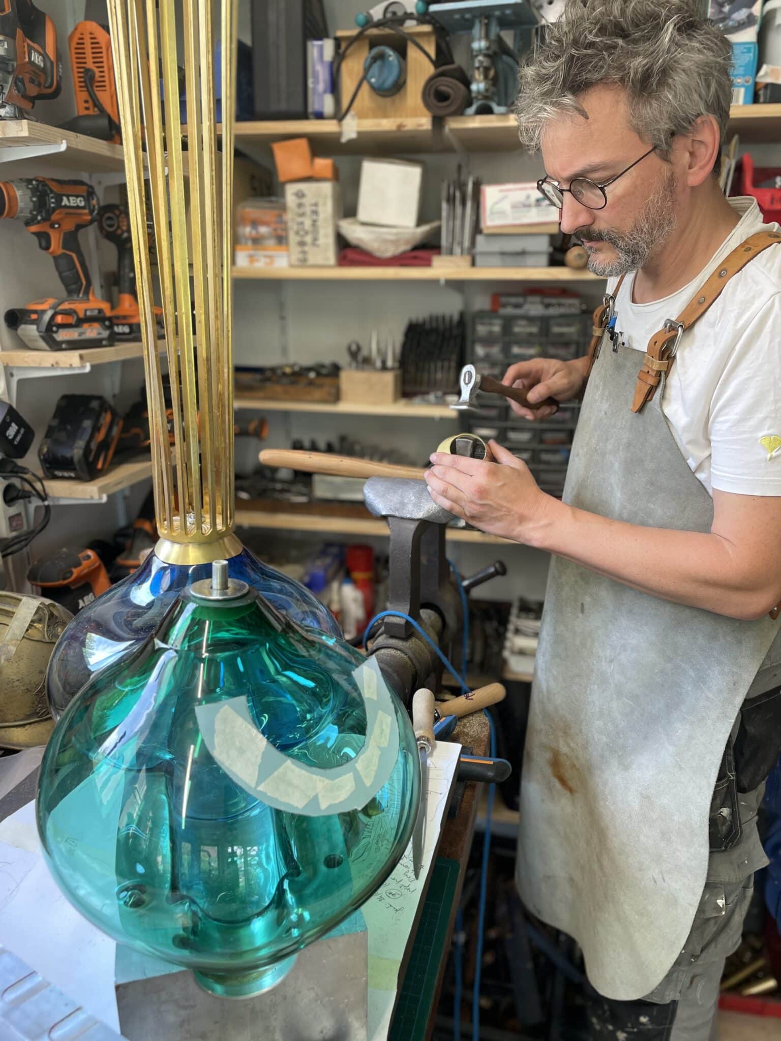 Arnaud Magnin est un bronzier d’art reconnu, Meilleur Ouvrier de France, spécialisé dans la création de luminaires haut de gamme et d’objets décoratifs en laiton et en bronze. Expert des techniques traditionnelles de monture en bronze, de tournage d’art du laiton et de mise en forme des métaux au marteau, il perpétue un savoir-faire d’excellence tout en le mettant au service de la création contemporaine. Ancien professeur à l’école Boulle, il a transmis son métier à une nouvelle génération d’artisans d’art, affirmant son rôle essentiel dans la transmission des métiers du patrimoine. Ses créations privilégient des lignes épurées et une alliance subtile des matières, où la maîtrise technique se fait oublier au profit de l’émotion et de la lumière. Dans son travail, la lumière – naturelle ou intégrée à l’objet – devient un vecteur de narration et de mise en valeur des matériaux. Créateur, artisan et expert en maîtrise d’œuvre, Arnaud Magnin est aussi un interlocuteur de choix pour les designers, artistes et architectes d’intérieur. Sa connaissance approfondie des métaux et de leurs contraintes techniques lui permet de mener des projets sur mesure, du dessin à la fabrication, alliant esthétique, savoir-faire et exigence.