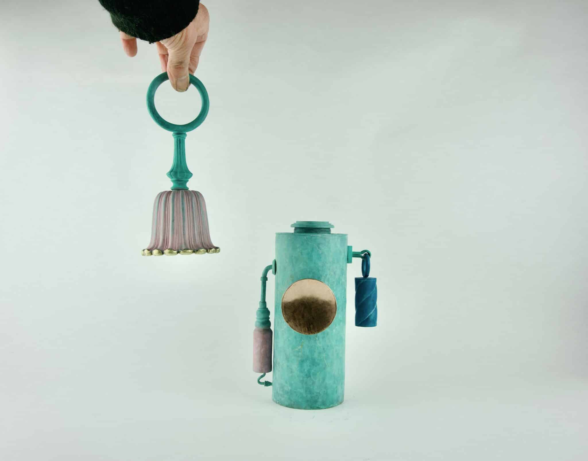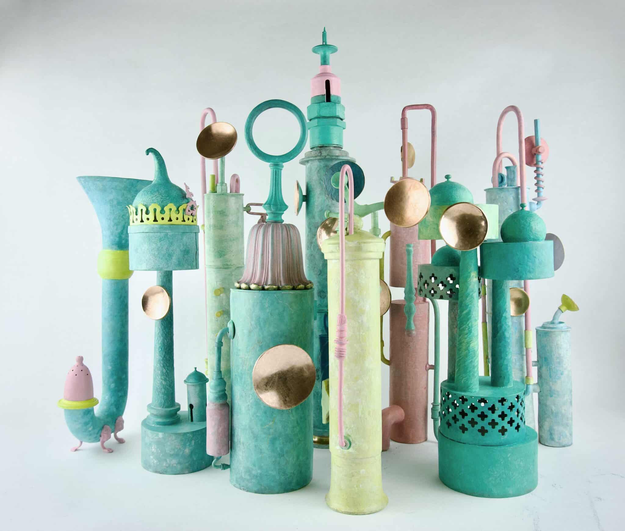Formée pendant de nombreuses années aux métiers d’art traditionnels, notamment en orfèvrerie, dinanderie et sculpture, cette artiste développe aujourd’hui une pratique singulière de la sculpture métallique. En associant ces techniques anciennes à la patine, elle crée des œuvres colorées, principalement en cuivre. Conscient des enjeux environnementaux liés à l’extraction minière, elle privilégie l’usage de matériaux récupérés et réemploie volontairement métal recyclé et pièces détournées. Depuis plusieurs années, Cécilia Moore se consacre au martelage de tôle, une technique artisanale lente, exigeante et méditative, qui lui permet de créer des formes creuses en métal. Pour rompre avec cette rigueur rythmique, elle entame la série « Strange Shores », présentée ici. Ces sculptures, aux allures architecturales, convoquent ses souvenirs d’enfance : voyages en bateau, quais industriels, stations balnéaires colorées et raffineries de pétrole. Au fil du processus, les pièces gagnent en complexité : tuyauteries, éléments en bronze poli, jeux de couleurs et formes modulables donnent aux sculptures une dimension ludique et narrative. Chaque assemblage devient un paysage miniature à recomposer, à mi-chemin entre mémoire personnelle, architecture fantasmée et design sculptural.