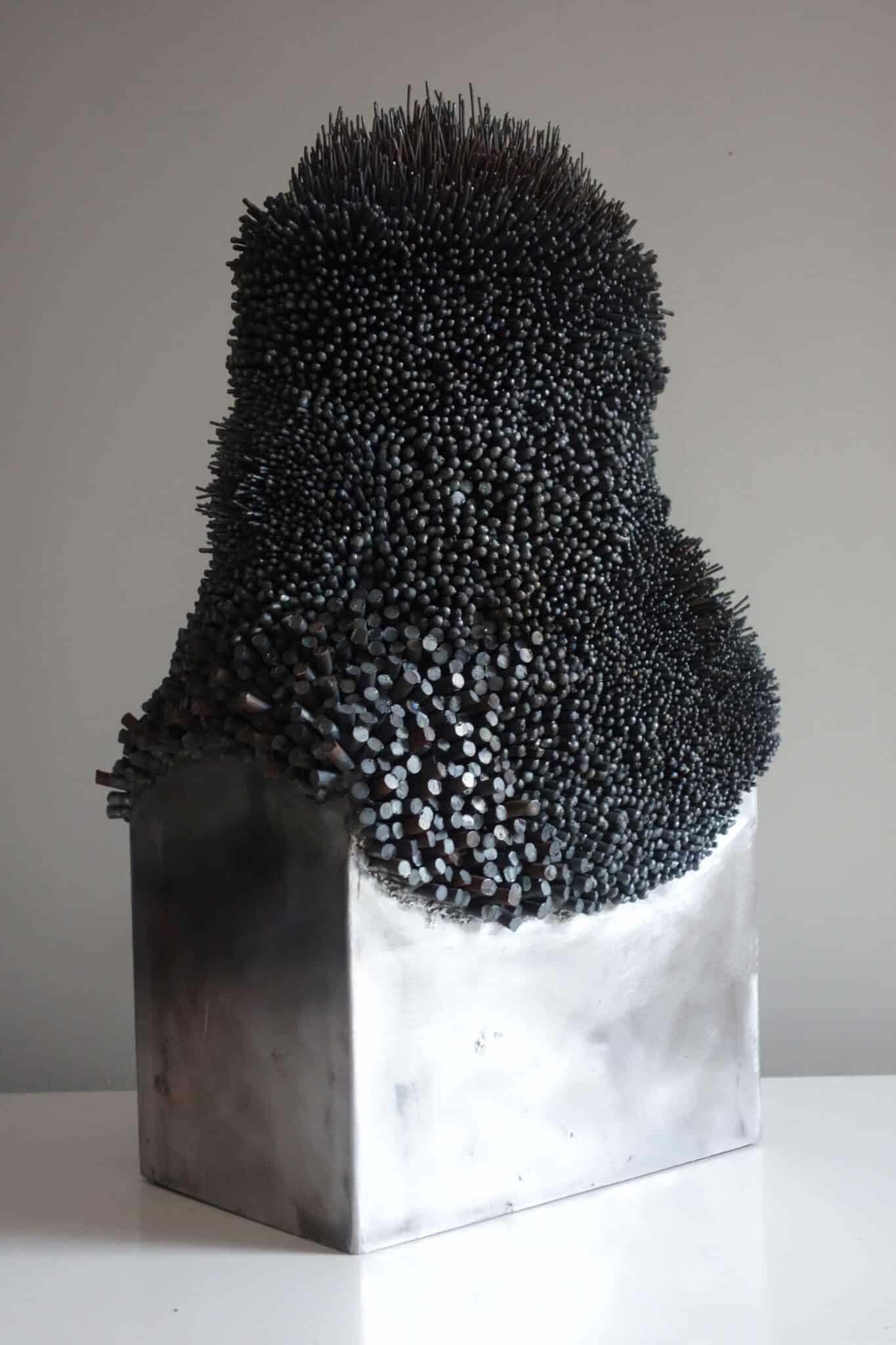 Juliette Frescaline façonne le fil de fer — parfois de cuivre — pour créer des sculptures contemporaines aux allures de végétaux fantastiques, de textures en trompe-l’œil ou de créatures organiques. Son travail, mêlant patience et minutie, transforme ce matériau modeste en une matière plastique singulière, souvent soudée point par point à la flamme. Inspirée par le monde végétal, elle capte la beauté du quotidien et la transcrit à travers des œuvres qui interrogent notre perception tactile. En jouant sur la corrosion, la densité, l’accumulation, elle crée une matière visuelle et sensorielle inédite. Les visiteurs, face à ses pièces comme L’Air est plein du frisson des choses qui s’enfuient — clin d’œil à Baudelaire — sont souvent tentés de toucher, trompés par l’illusion d’une douceur. En perpétuelle recherche de textures métalliques nouvelles, Juliette Frescaline renouvelle sans cesse son langage plastique, entre sculpture, poésie visuelle et sensation tactile.