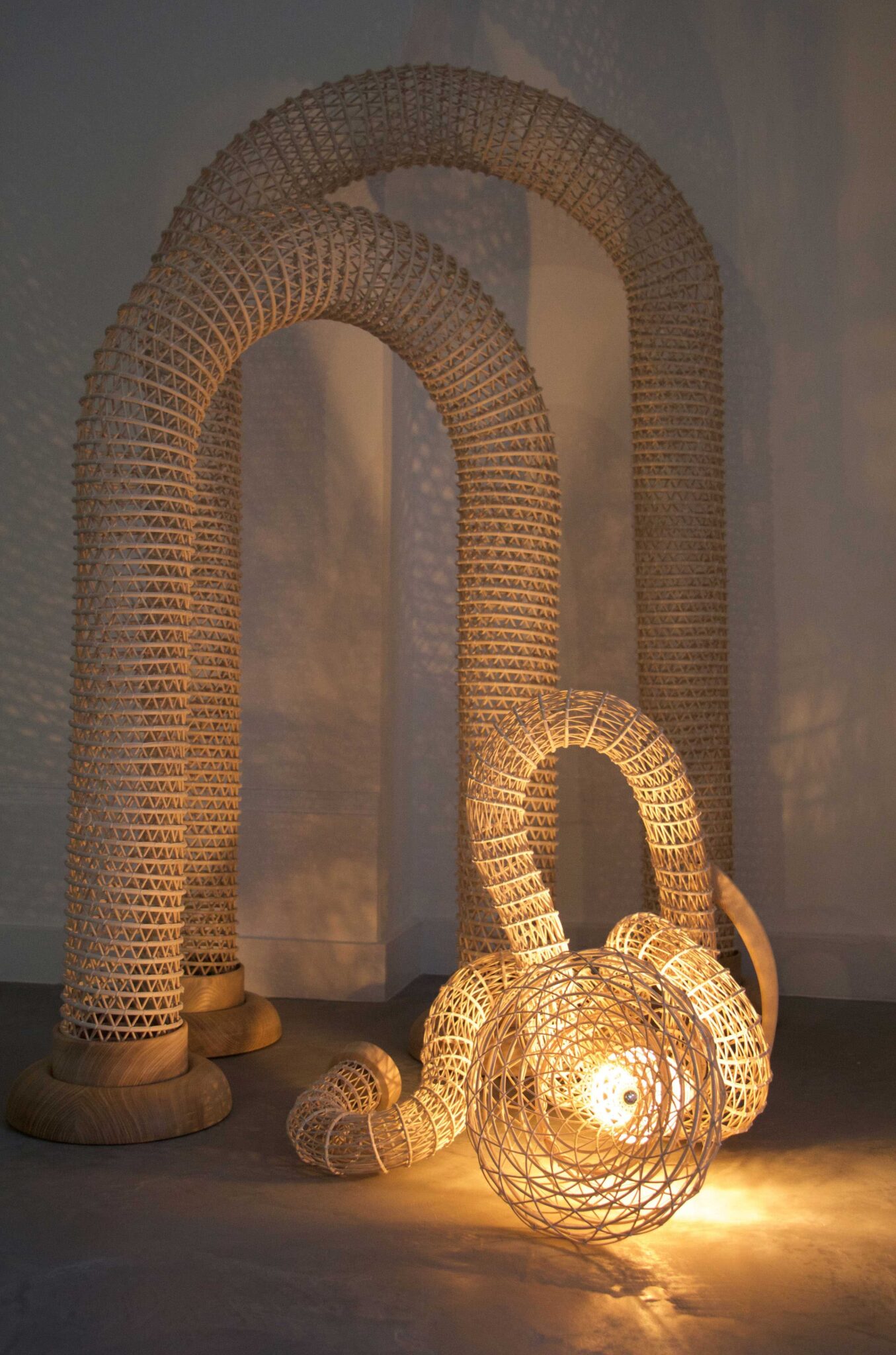 Artiste textile et diplômée de l’ESAD de Saint-Étienne, Gwendoline Del Campo explore les savoir-faire artisanaux du monde entier. Inspirée par sa rencontre avec le designer Cheick Diallo à Bamako, elle associe fibres naturelles (mohair, coton, rotin) et gestes ancestraux : tissage, vannerie, dentelle… Ses sculptures mêlent ombre et lumière dans une quête de transparence et de poésie organique. Son travail, entre art textile et design, est exposé dans plusieurs galeries d’art en France, Belgique et Suisse.