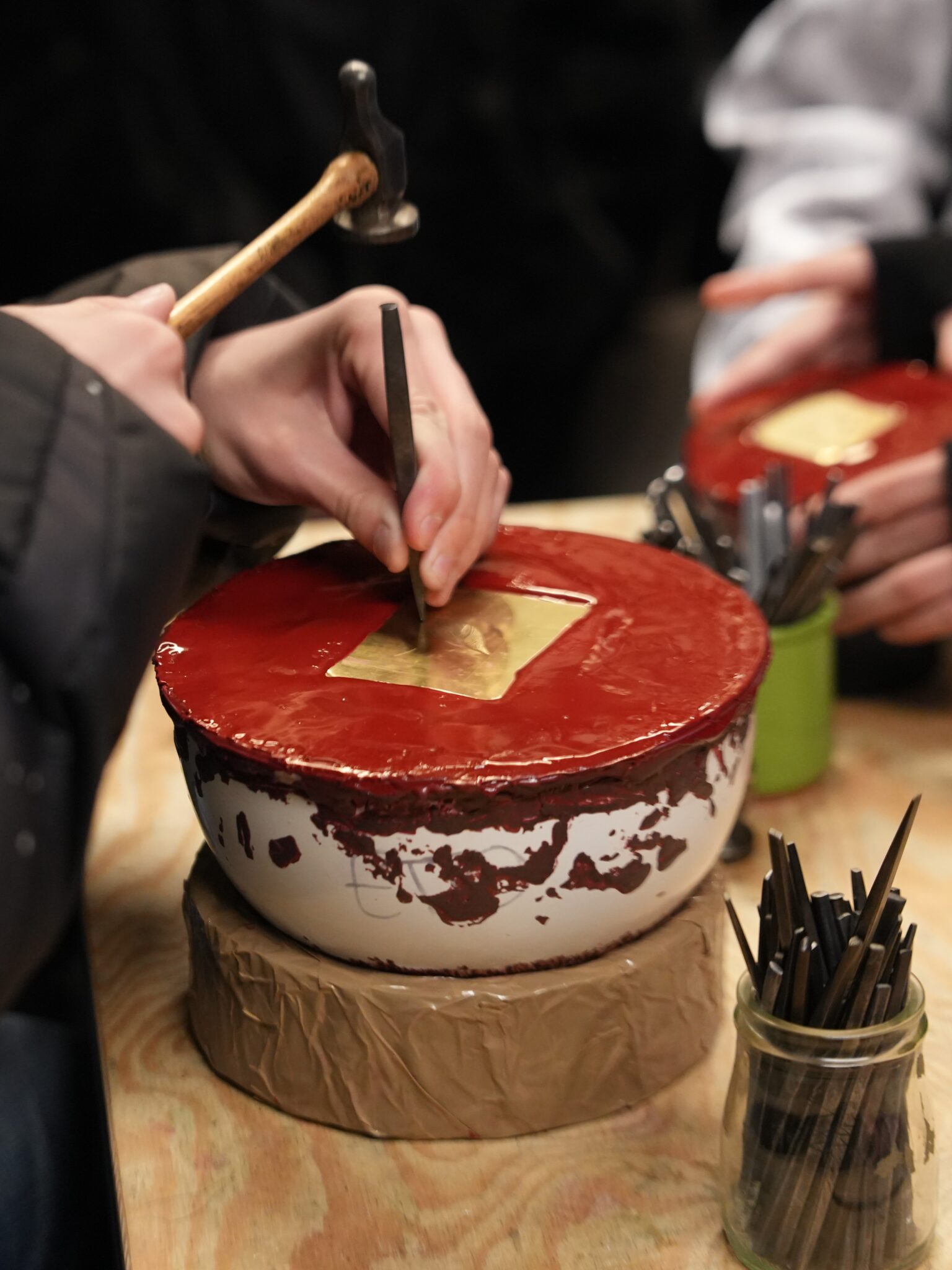 Les enfants seront invités à dorer trois petits objets en utilisant trois feuilles de métal différentes : aluminium, cuivre et or. À l’aide d’un pinceau, ils apprendront à encoller les surfaces avec la « mixtion à l’eau », une colle spéciale utilisée en dorure. En toute autonomie, ils pourront ensuite dorer deux objets avec les feuilles d’aluminium et de cuivre. Pour le troisième, ils seront guidés pas à pas dans la pose délicate de la feuille d’or véritable. Un atelier à la fois créatif et ludique pour expérimenter la magie des métaux brillants !