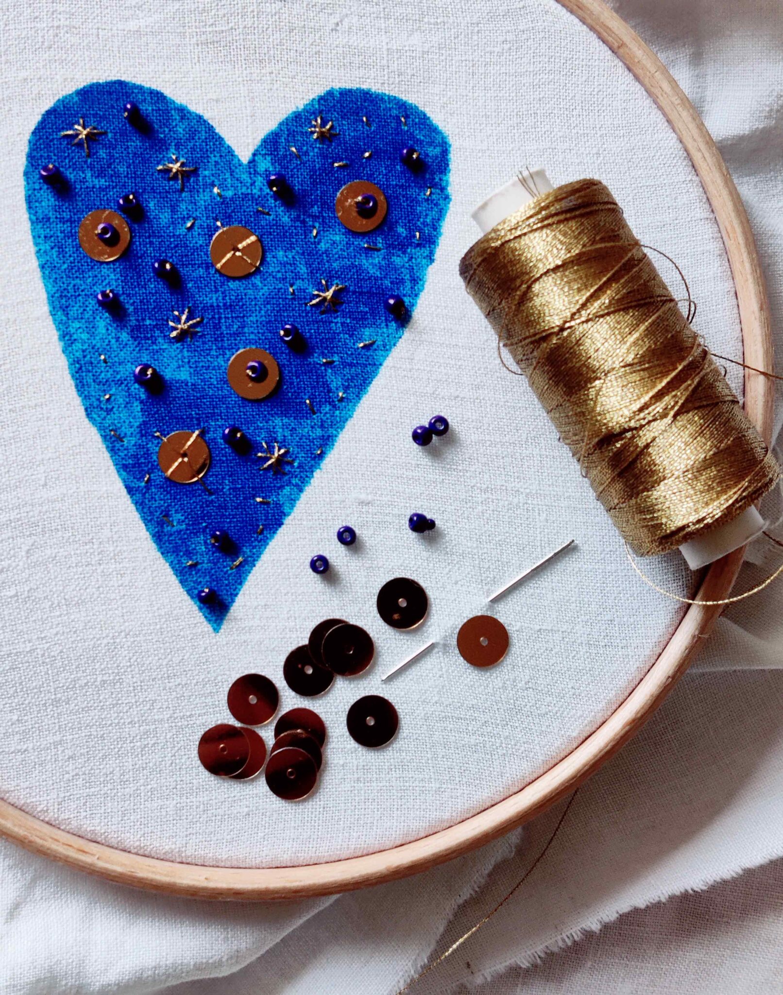 Chaque enfant se verra remettre un morceau de tissus blanc sur lequel est imprimé au pochoir un cœur bleu. Muni d'une aiguille et d'un fil doré, il pourra venir broder quelques points avant et des étoiles dans ce cœur. Dans un second temps, ils viendront enrichir ce cœur par la pose de perles et de sequins. Les enfants auront ainsi l'occasion d'expérimenter le geste du brodeur qui traverse avec une aiguille et du fil le tissu. Ils pourront également expérimenter la diversité des matériaux utilisés pour orner un tissu.