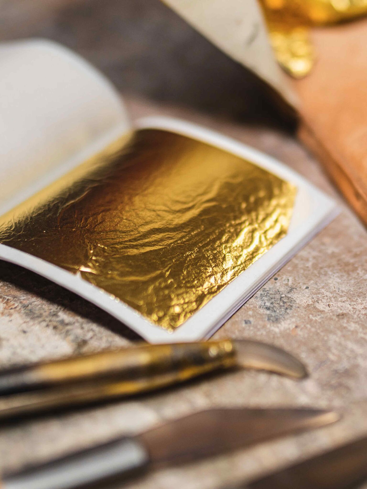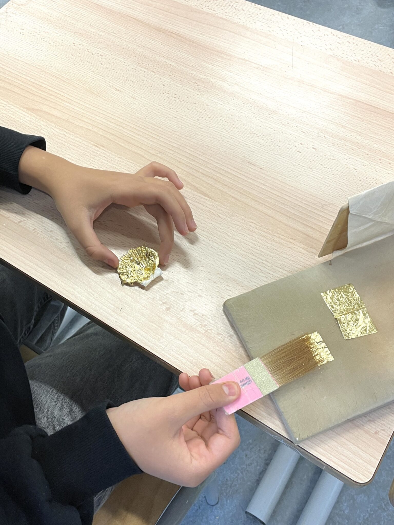 Coussin, palette, couteau : voici la liste du matériel mis à votre disposition pour initier les enfants à la dorure à la feuille d'or ! Lors de cet atelier, ils apprendront à manipuler la fine feuille d’or, à l’appliquer avec soin et à la faire briller comme un vrai petit trésor. Guidés étape par étape, ils créeront leur propre objet doré à rapporter fièrement à la maison.