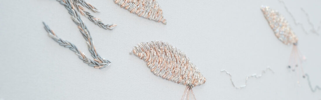 Simone Pheulpin, figure emblématique de l’art textile contemporain, sublime de simples bandes de coton brut en sculptures aux allures de corail, écorce, coquillage ou pierre fossilisée. Son geste sculptural précis donne naissance à une œuvre monochrome, mono-matière, où chaque forme semble issue de la nature elle-même. Son processus — fait d’enroulements, de serrages et d’empilements — est un travail méditatif. Les épingles dissimulées sous le tissu écru renforcent l’illusion d’un monde organique, mystérieux et silencieux.