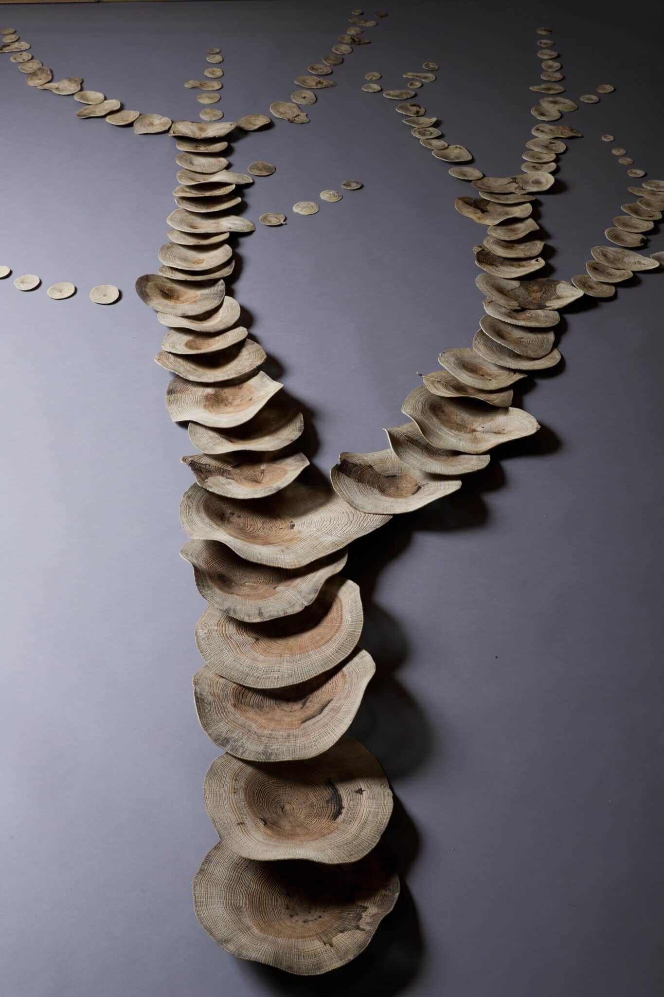 Pour cela il a choisi un chêne du Jura destiné à être coupé, haut de 26 mètres et âgé d’un peu plus de 100 ans. Il a été photographié et numérisé afin de garder une mémoire de sa structure. Avec l’aide d’experts arboristes- grimpeurs, il a été démonté branche par branche, puis l’artisan d’art l’a décomposé en près de 800 tranches de dentelles, de la base jusqu’au bout des branches. L’idée est ensuite de le reconstituer en 3 dimensions, à une échelle plus raisonnable pour être présenté sur l’un des balcons du Grand Palais pour Révélations. Le public aura l’opportunité de découvrir cette pièce exceptionnelle et inédite, au 1er étage de ce lieu emblématique de la France.