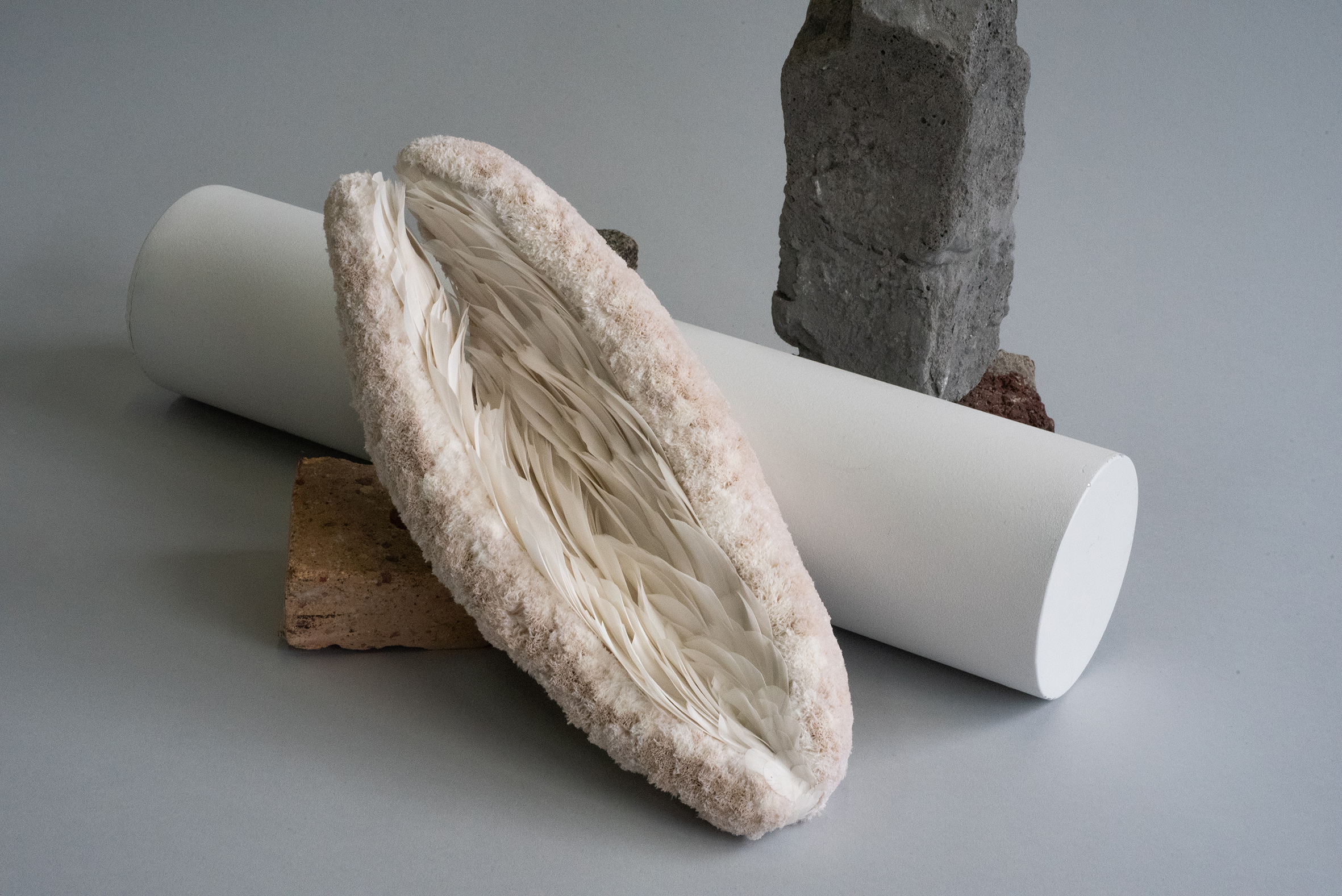 Marion Hawecker expérimente la plume d’oiseau dans une collection de sculptures d’exception. À travers cette matière animale qui la fascine (les plumes sont issues d’élevages destinés à la consommation), elle révèle son admiration pour la force vitale du vivant. Fragments de magma, géodes, replis de terre où germent et prolifèrent des microcosmes..., ses créations évoquent la nature par des effets de mimétisme et d’analogie. Les plumes sont coupées, sculptées ou nouées selon le savoir-faire traditionnel de la plumasserie, associé à des techniques plus personnelles comme le « tuffeté d’autruche ». Sensuelles et soyeuses, les pièces de Marion Hawecker suscitent une irrésistible envie de caresse.