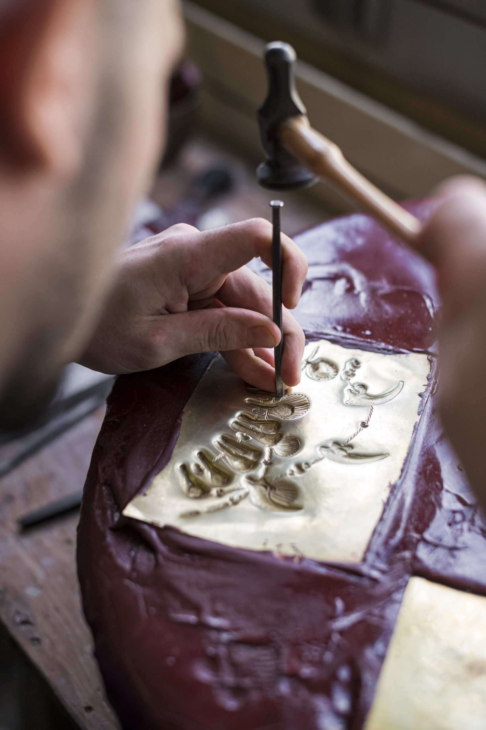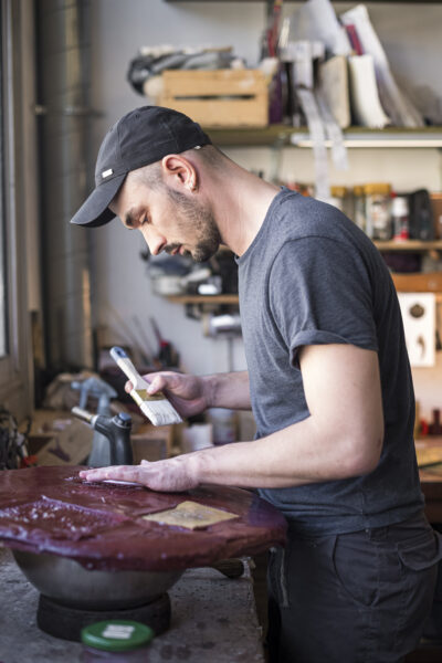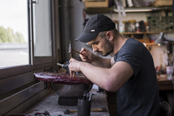 Louis Biron, artisan-designer, formé à la ciselure à l’Ecole Boulle et lauréat PJCMA 2020, prix de la jeune création métiers d’art porté par Ateliers d’Art de France, détourne les objets quotidiens de notre société en œuvres engagées. Dans son approche de la bio-intégration, l’artiste interroge notre rapport au vivant à travers un processus créatif qui laisse la nature participer en marquant son empreinte, comme les mollusques qui dessinent des pièces avec lui. Rencontre avec Louis Biron